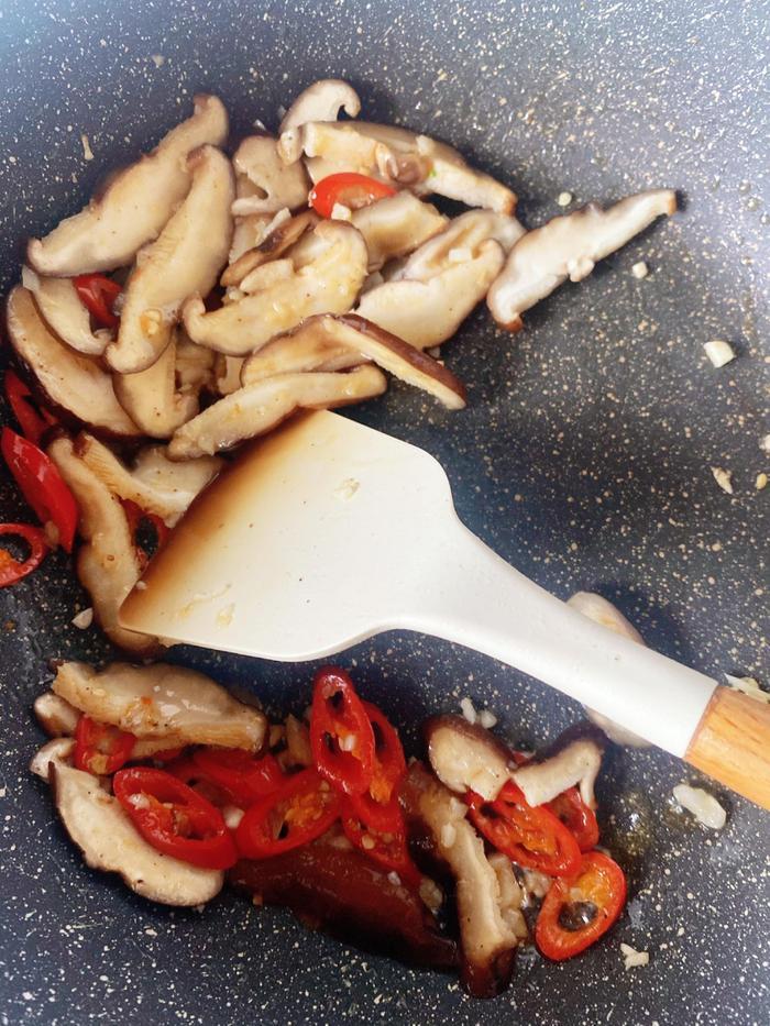 接下来,热锅凉油,放入蒜末、小米辣和花椒粉,炒香出诱人的香味。随后,加入切好的香菇片,翻炒片刻,让香菇释放出它们独特的风味。