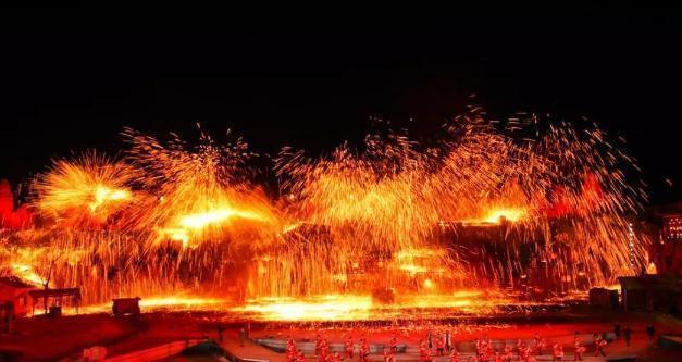 夜色降临的时候,在司徒小镇的人工湖广场上会上演精彩的千年绝技“打铁花”,这可是省级非物质文化遗产。匠人们用熔炉将生铁熔化成数千摄氏度高温的铁汁,然后用力抛向天空,朵朵铁花如天女散花一般在空中绽放,火光璀璨,绚丽夺目,结束千年铁花演出,还有《千年铁魂》实景演出,带你穿越千年煤铁历史。