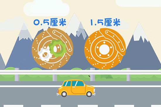 全新的刹车片厚度一般在1.5厘米左右,在日常磨损的情况下,可以检查刹车片的厚度,当刹车片的厚度仅剩全新刹车片的1/3左右时,需要随时准备更换新的刹车片。若刹车片两侧有凸出的小标志,则说明刹车片的使用已经到达极限,需要及时更换。