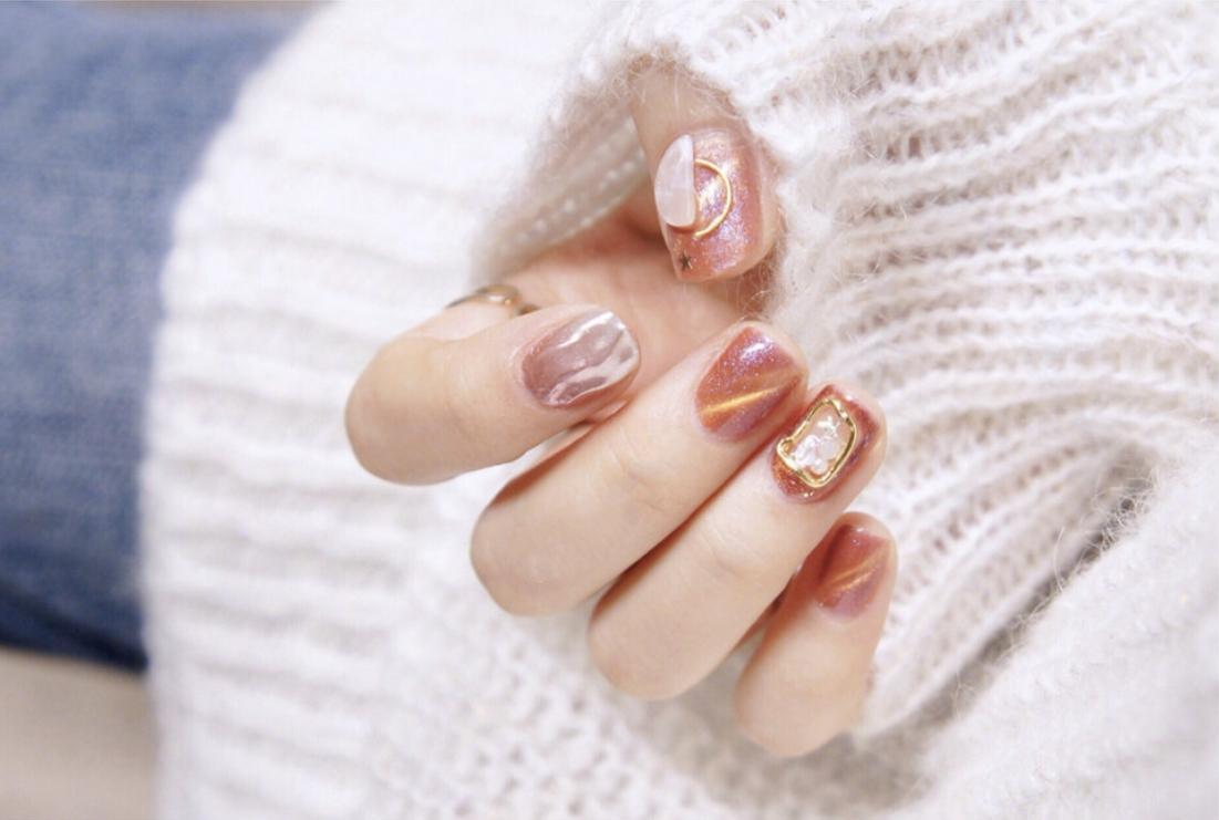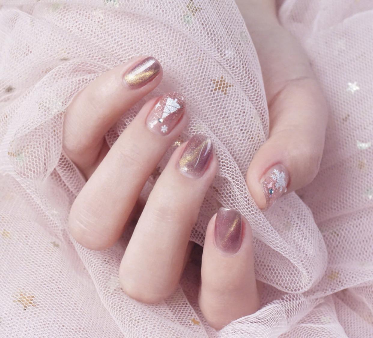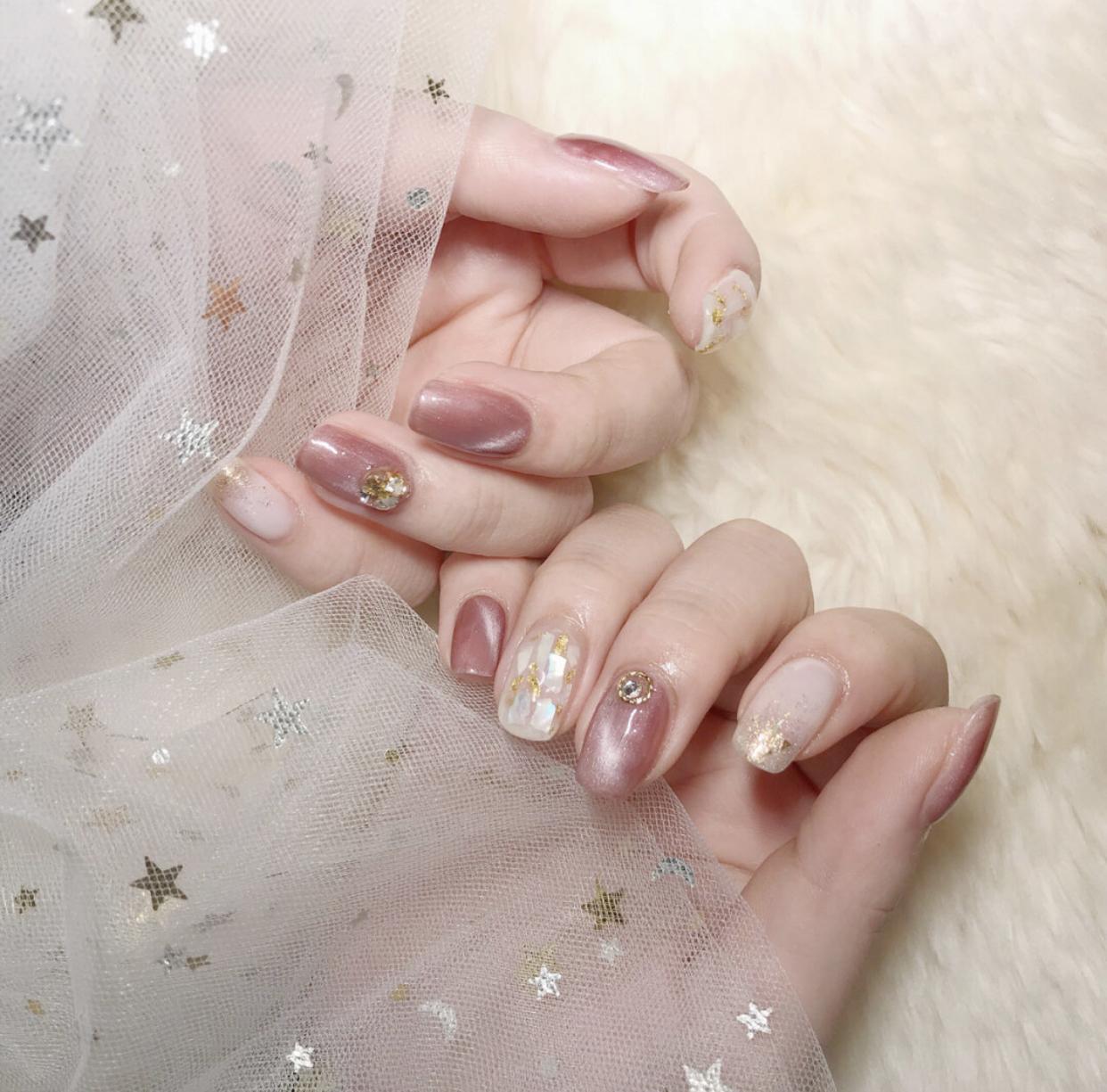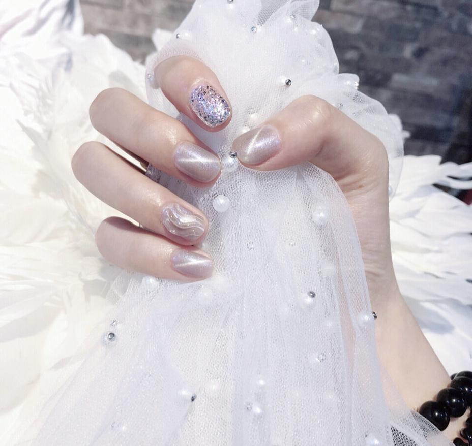 在裸色美甲中,加入个别猫眼美甲,会让指尖更有亮点,裸色系的美甲有着非常温柔优雅的气质,是很多上班族们非常喜爱的款式,但如果是清一色的裸色美甲,未免显得有些单调,用同样优雅的裸色猫眼甲,来作为点缀,就可以很好的改善这种单调感了。