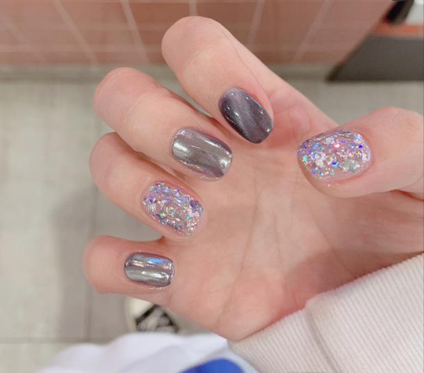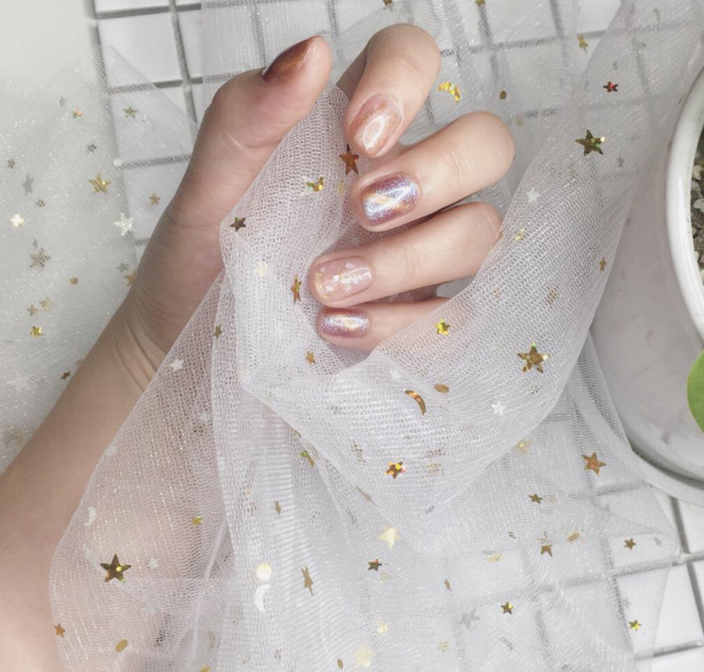 还有像这样的亮片猫眼甲,在原有的亮片美甲上,加上半透明的猫眼甲,打造成复合型的猫眼甲,会有更加特别的质感,不同的发光元素,会呈现出不同的光泽感,让美甲显得更加精致独特,有着非常梦幻的少女风,搭配上纯色美甲,超美的!
