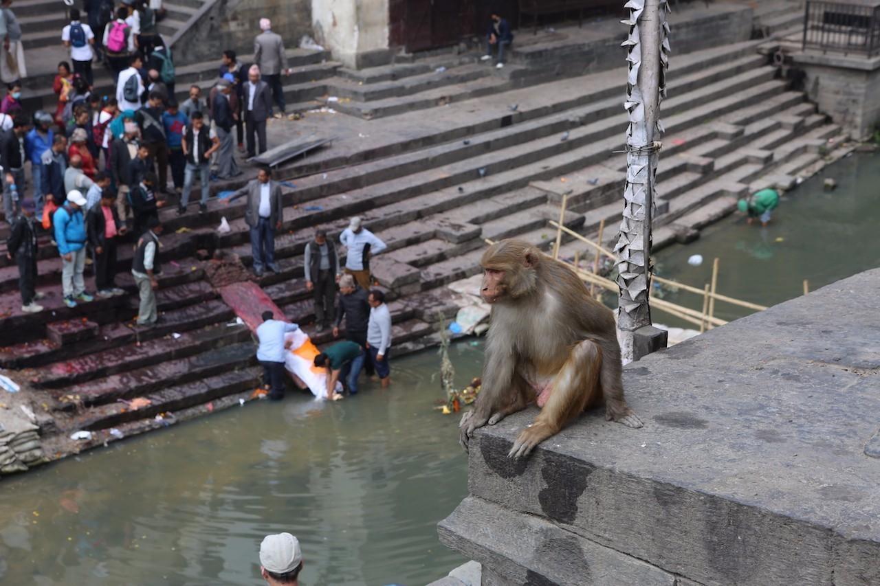 烧尸庙也有很多猴子。它们坐在高处,看着这里来去的人,注视着这一切。每天都看到这样的场景会不会对它的猴生产生深远的影响呢?