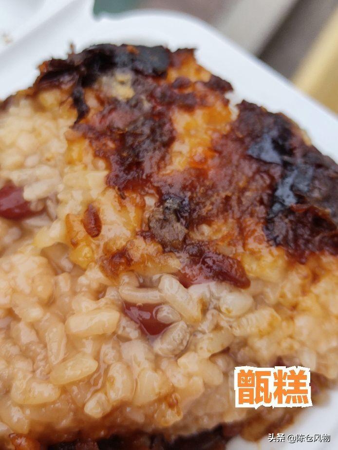 这些年,陕西很多超市和陕西风味饭店里售卖新派甑糕,但米枣豆分层明显,最上层一排大枣,糯米层压得很实,与东府西府传统的不同,反倒与关中的铡糕(也叫切糕)很像。铡糕是将糯米与枣分层压实,提前蒸好成条形或圆形,高度与水杯差不多,切成菱形柱状摆在蒸屉上售卖,因为比较密实,直接用木棍插着拿在手里吃也不会散。铡糕(西安多叫切糕)与甑糕的区别就是铡糕密实可以拿手里,枣少米多一般不放豆子,也因此凉了的铡糕会有点硬,所以一定要买加热好的。西安还有一种美食桂花糕,也差不多这个做法,黄橙橙的颜色来自澄粉,用枣泥分层,淋桂花糖浆。