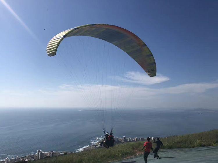 大西洋风平浪静的时候,从信息山上往海面滑翔,蓝天白云下,这惊心动魄的宽广见证了勇敢者展示和挑战自我的壮举!