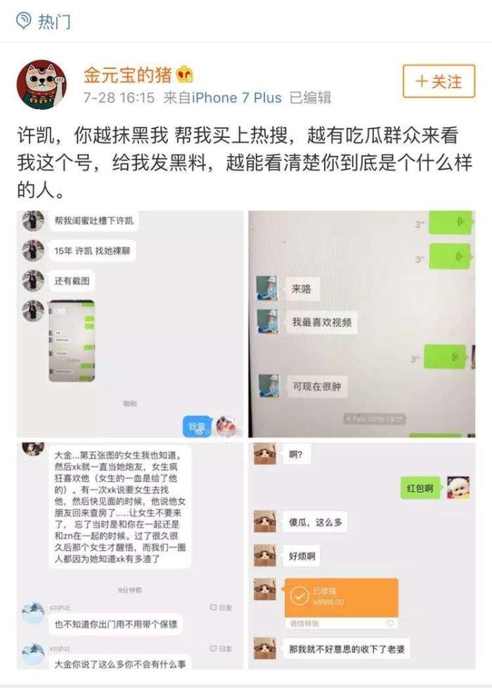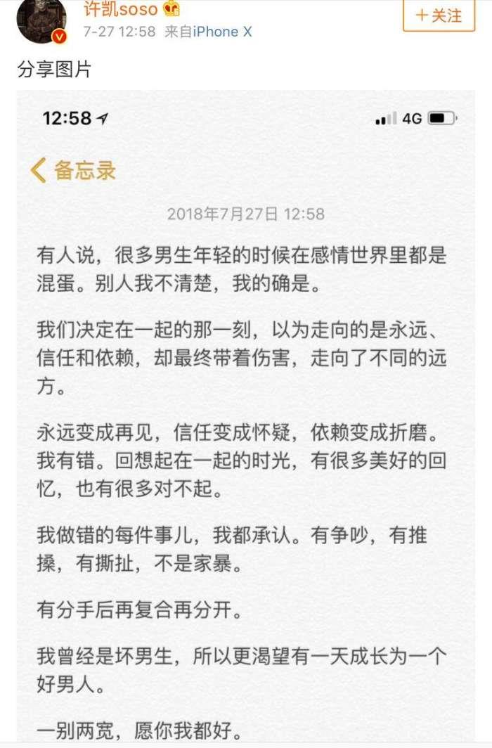 许凯自己也在微博承认错误,说有撕扯过,但否认家暴,并用年少不懂事来做借口,希望得到前任原谅。