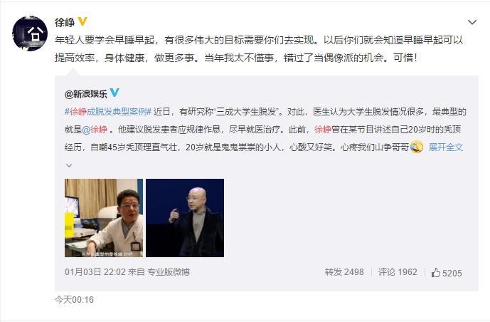 1月5日,徐峥于微博转发并回应了“脱发典型案例”一事,他称:“年轻人要学会早睡早起,有很多伟大的目标需要你们去实现。以后你们就会知道早睡早起可以提高效率,身体健康,做更多事。当年我太不懂事,错过了当偶像派的机会。可惜!”