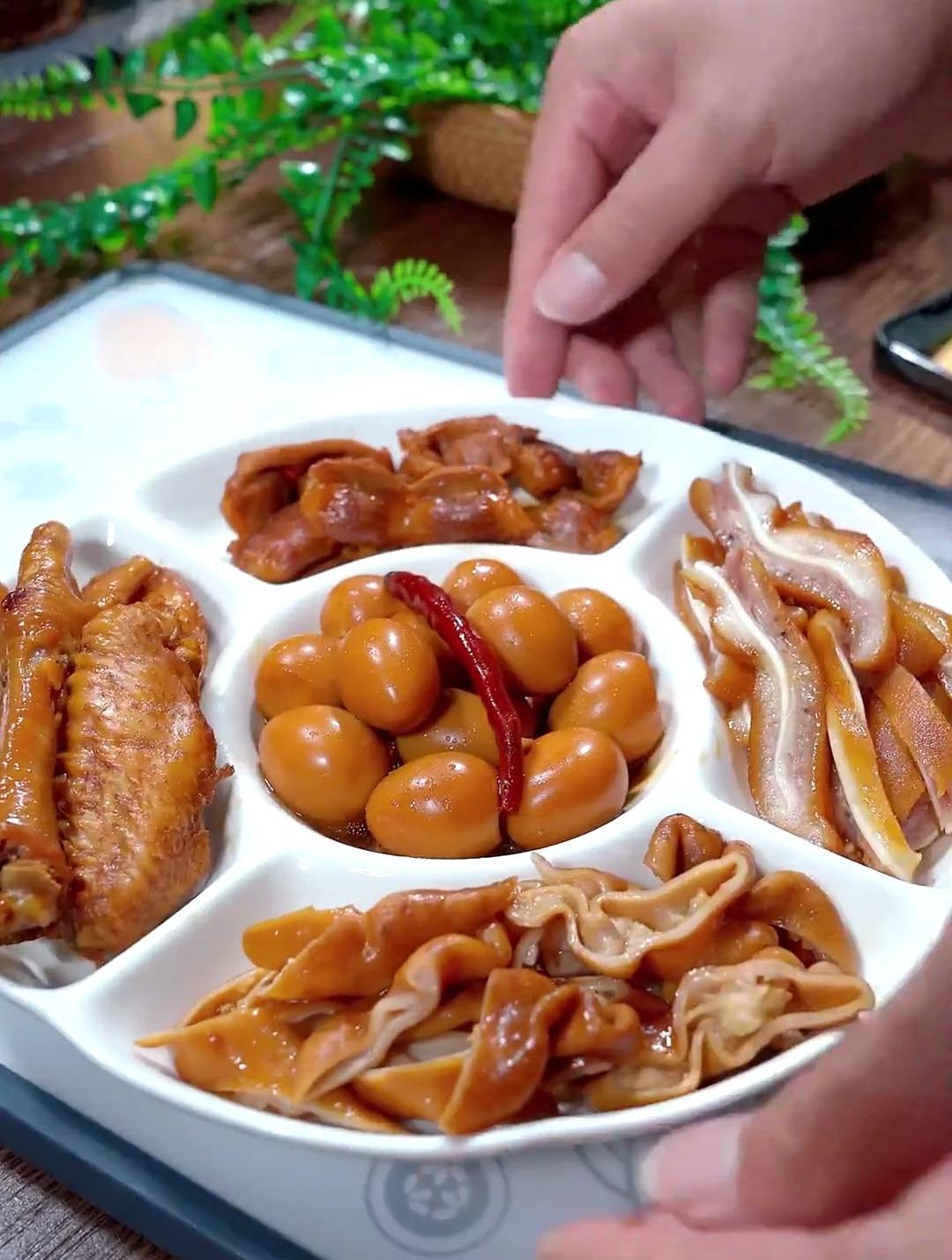 潮汕卤味是潮州菜当中最富盛名的菜之一,卤鹅,卤鸭掌,鹅掌,鸡爪,五花肉,猪蹄,大肠等等,每逢年过节或有红白事的时候,潮汕卤味都是不可或缺的一道菜,首先将猪骨底汤料放入其中熬成高汤,随后加入桂皮,香叶,小茴香,八角等香料,经过小火慢熬成鲜香的汤,再将要卤的食材放入其中,在卤的过程中要翻转几次火候也要掌握的刚刚好,这样出锅后的卤味鲜香可口,食欲罢不得。
