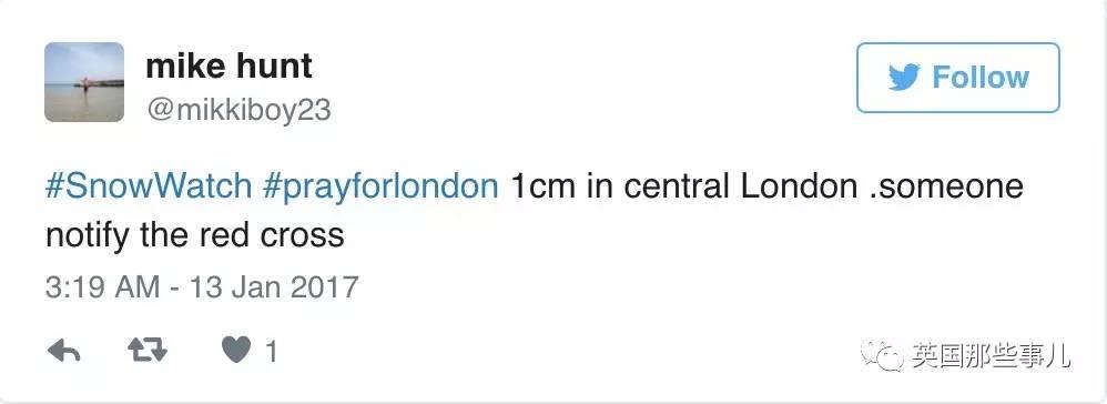 “伦敦市中心也就下了1厘米的雪吧,有人通知了红十字会”。