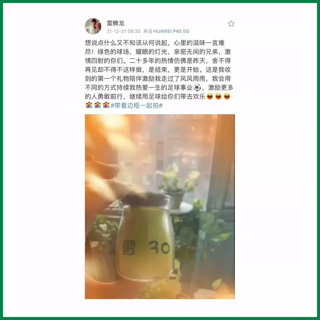 ▲雷腾龙微博宣布结束绿茵生涯