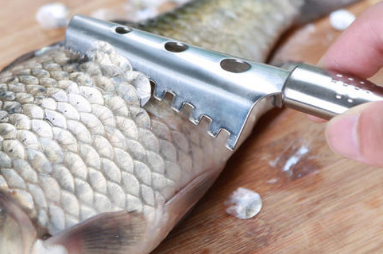 用刀背将鱼拍晕,然后用刀斜向鱼头将鱼鳞刮干净,鱼鳍和鱼肚子上的鱼鳞要仔细刮,接着用刀从鱼尾尾鳍处往鱼嘴处划开口子,用手指掏出里面的内脏和鱼鳃冲洗干净,在鱼头和鱼尾处各划一刀抽出里面的鱼腥线,可以去除鱼肉的腥味。