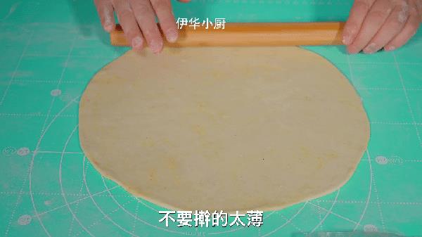 7、然后取出第一个面积,擀成薄饼,想要饼层次分明,不要擀的太薄,厚度约0.3厘米