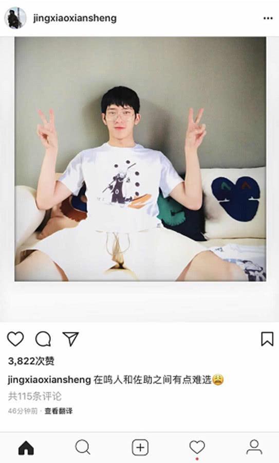 配文中写到“在鸣人和佐助之间有点难选”。照片中,他身穿印有火影忍者图案的白色T恤。嗯哼~最后似乎还是选了漩涡鸣人。