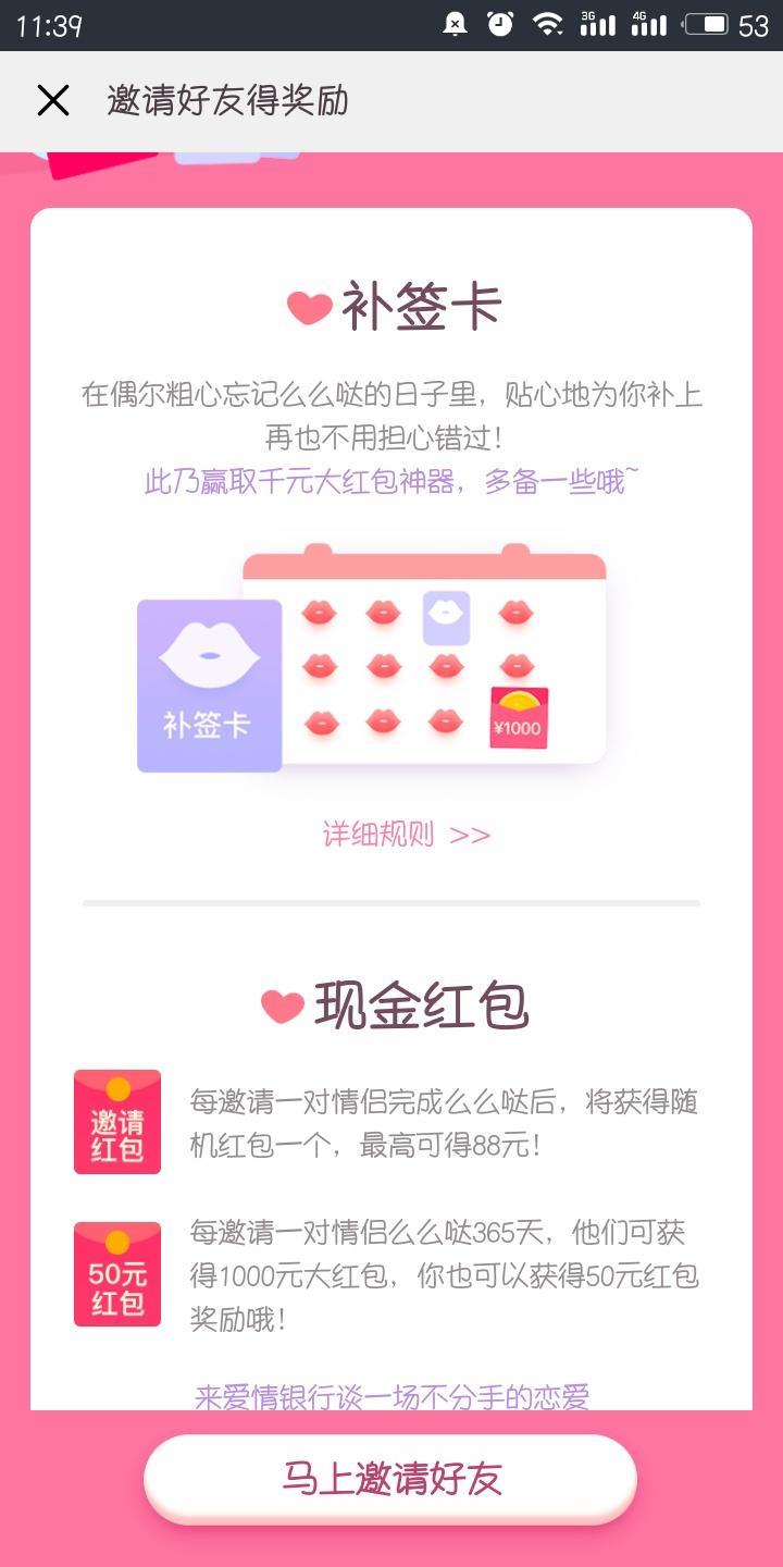 其实爱情银行补签卡目前只能通过邀请别人来获得补签卡,其实这也可以刷。