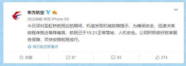 当日20时许,澎湃新闻(www.thepaper.cn)记者从东航获悉确有此事。东航发布消息称,12日深圳至虹桥航班巡航期间,机组发现机械故障提示,为确保安全,迅速决策按程序就近备降南昌,航班已于当天19:21正常落地,人机安全。公司积极做好旅客服务保障,尽快安排航班成行。