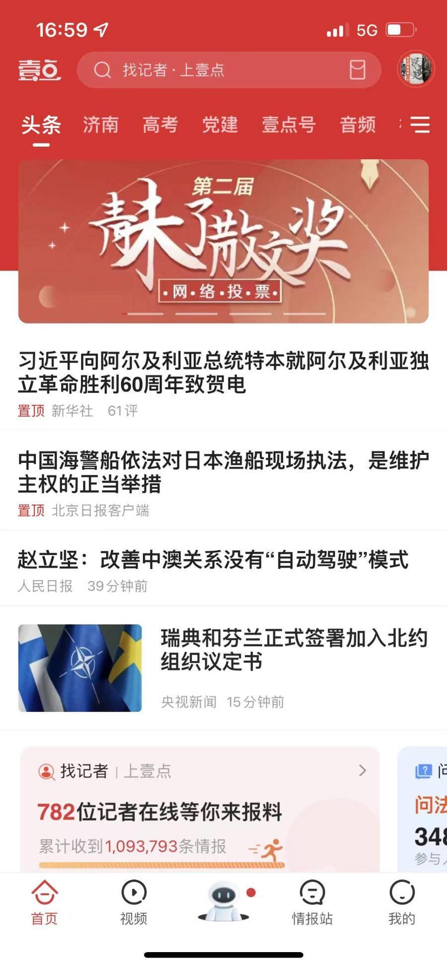 3 在齐鲁壹点首页轮播图点击进入活动页面,或首页上方搜索框输入“第二届青未了散文奖网络投票”,即可进入网络投票页面。