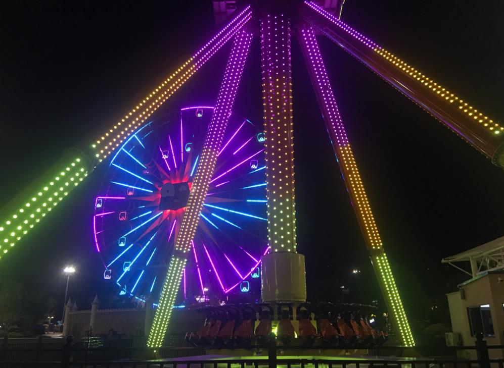 想要了解嬉戏谷的内在风情,就一定要留在它的夜晚,每晚4点过后,嬉戏谷整座园区便亮起霓虹,夜公园也随之开启。“幸福运转”摩天轮上层层叠叠的彩条,“疯狂360”大摆锤上绚丽闪动的灯光,“神殿山”上明亮的中华灯塔等等,它们装点着嬉戏谷的浪漫与繁华,无穷无尽闪耀的灯光,使嬉戏谷成为太湖湾上最亮丽的一个点,惹人注目。