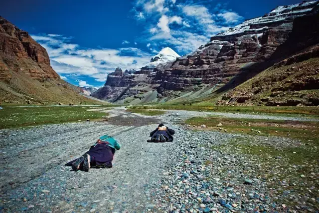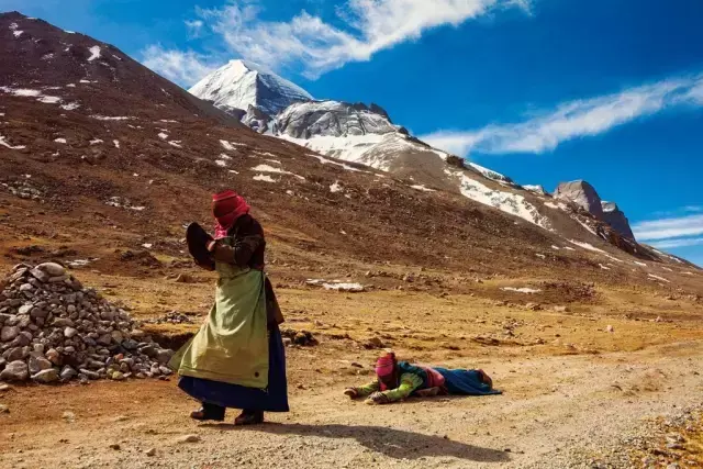 转山的人一般绕山行走,少数无比虔诚者则会五体投地对神山叩拜,他们从遥远的故乡开始,手上和膝上带着自己做的简易护套便三步一磕等身长头。他们常常只带最简单的食物,行进一年半载也不会放弃。