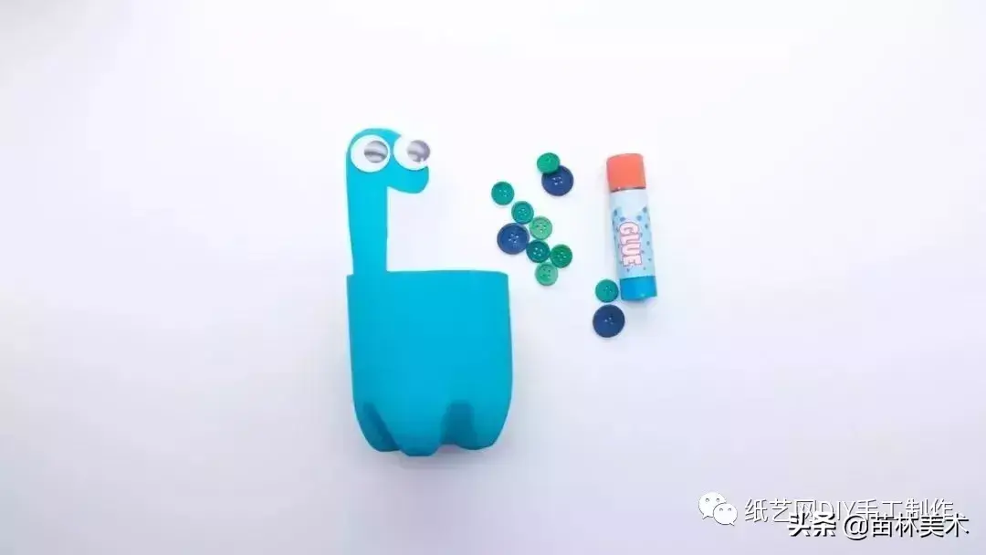 大塑料瓶、画笔、磨砂纸、钮扣、美工刀、颜料、彩笔、剪刀