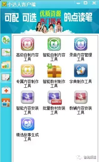 小达人点读笔是凭借着点读笔、任我贴/点读卡、客户端和网络平台的四维运营模式,让所有的普通书都能点读。