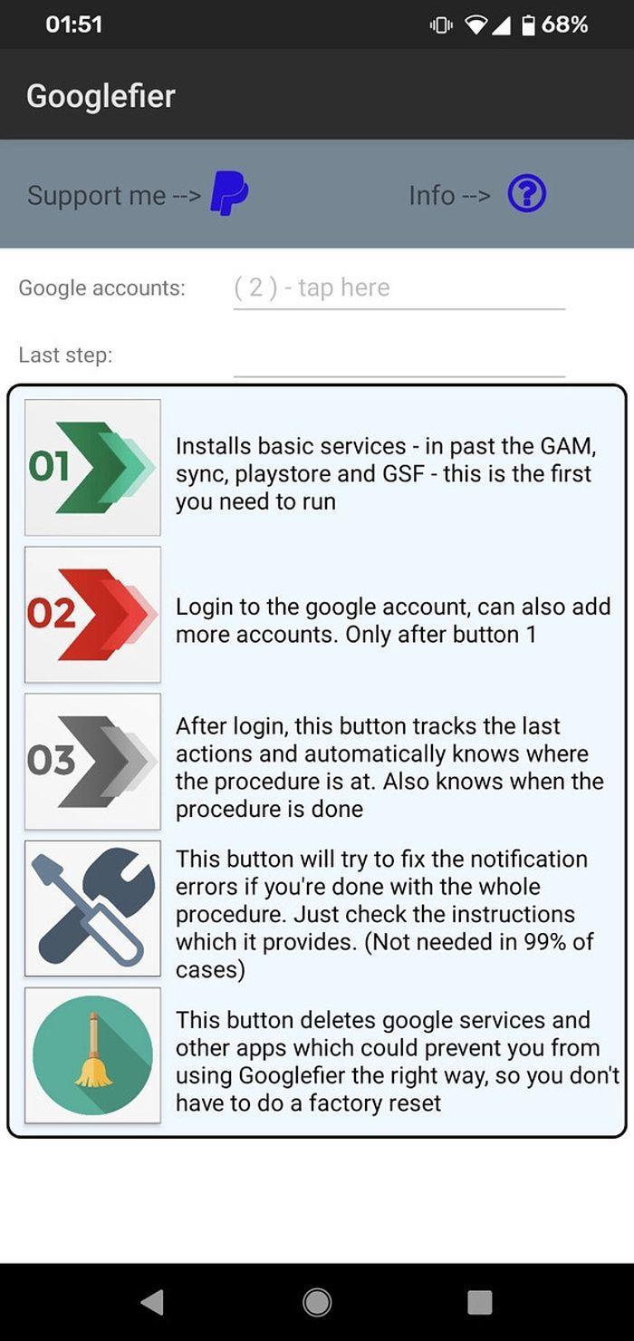 Googlefier 本质上是 XDA 高级会员 benter_007 的非官方 GMS 安装程序,他以前因从事 LG 手机的 AutoRec 项目开发而闻名。该应用提供了非常易用的操作指南和步骤,甚至不需要连接 PC 就能在华为和荣耀设备上安装 GMS 和谷歌应用程序。