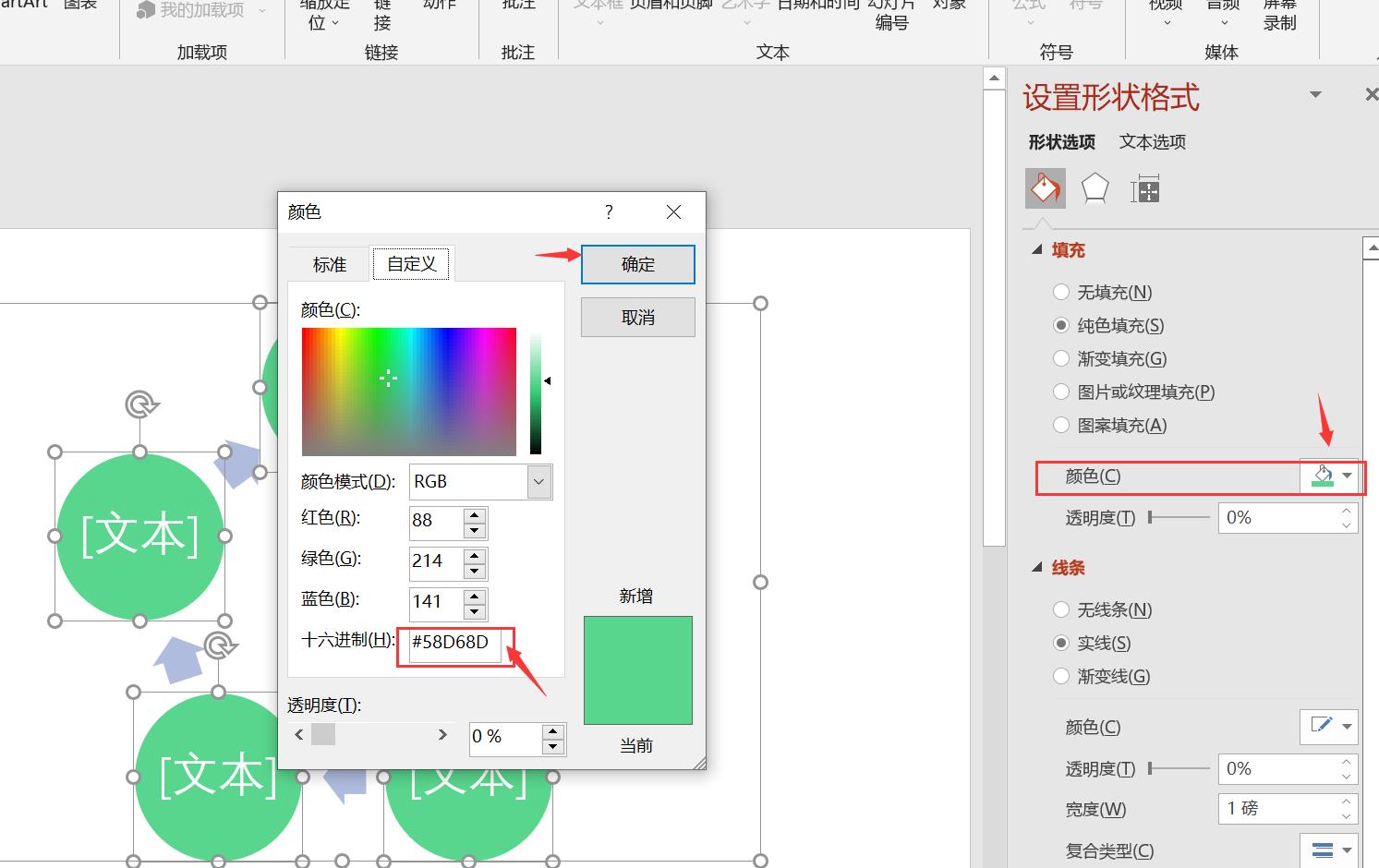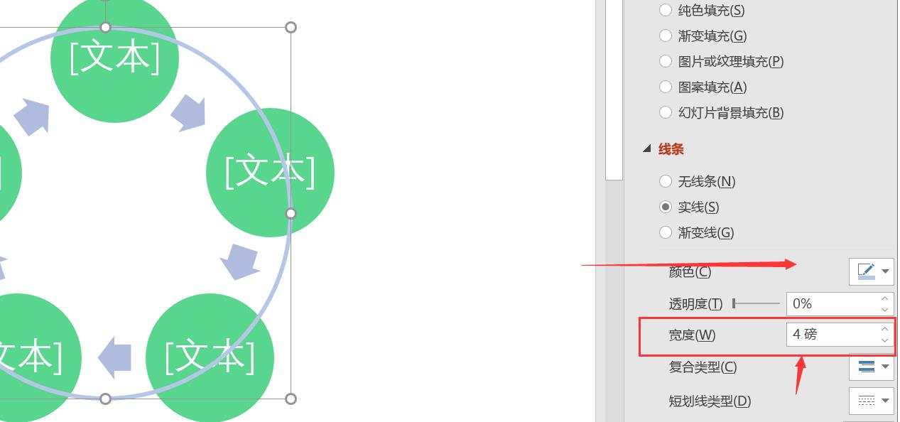 2. 选中所有圆形点击右侧颜色 ——颜色#58d68d——插入形状——椭圆绘制正圆——高度宽度都为13cm——形状填充——无填充——颜色调整为箭头颜色即可(也可按照自己的喜欢的颜色来填充)——宽度调整为4磅即可——鼠标右击置于底层——删除多余的箭头。
