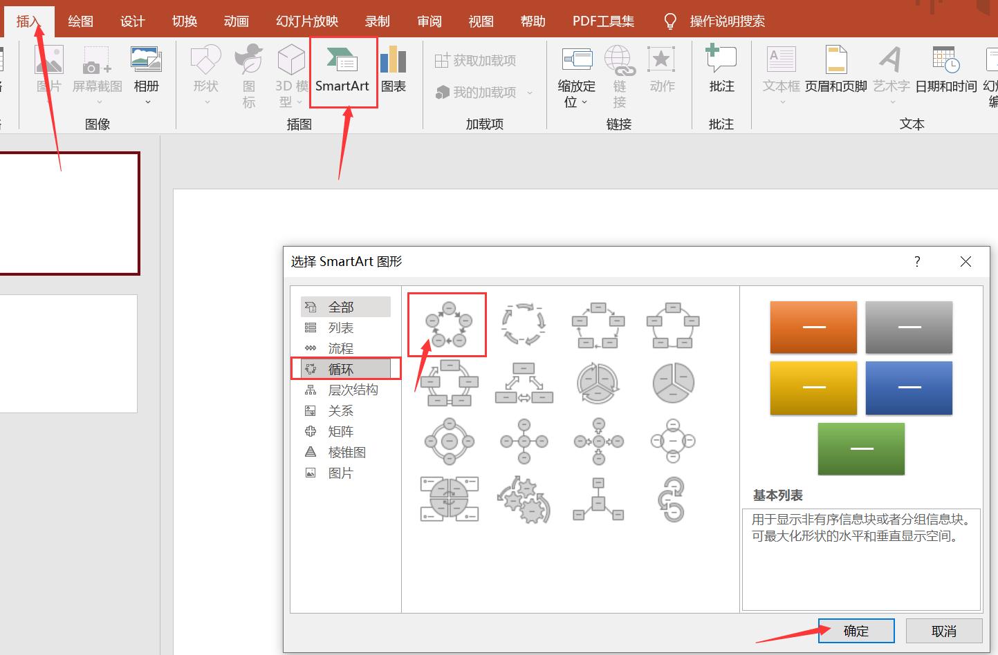1. 首先插入一张空白的幻灯片——插入SmartArt工具——循环第一个图形——ok ——右键组合——(取消组合)。