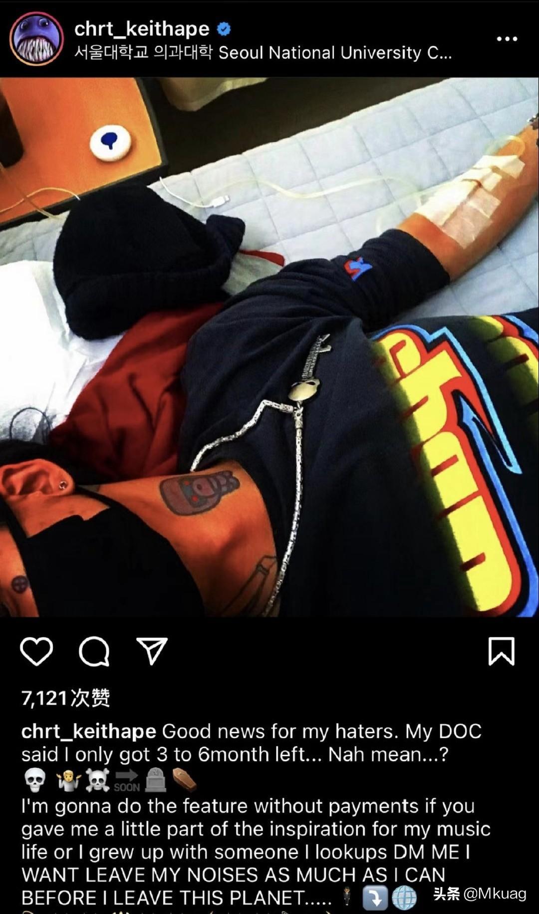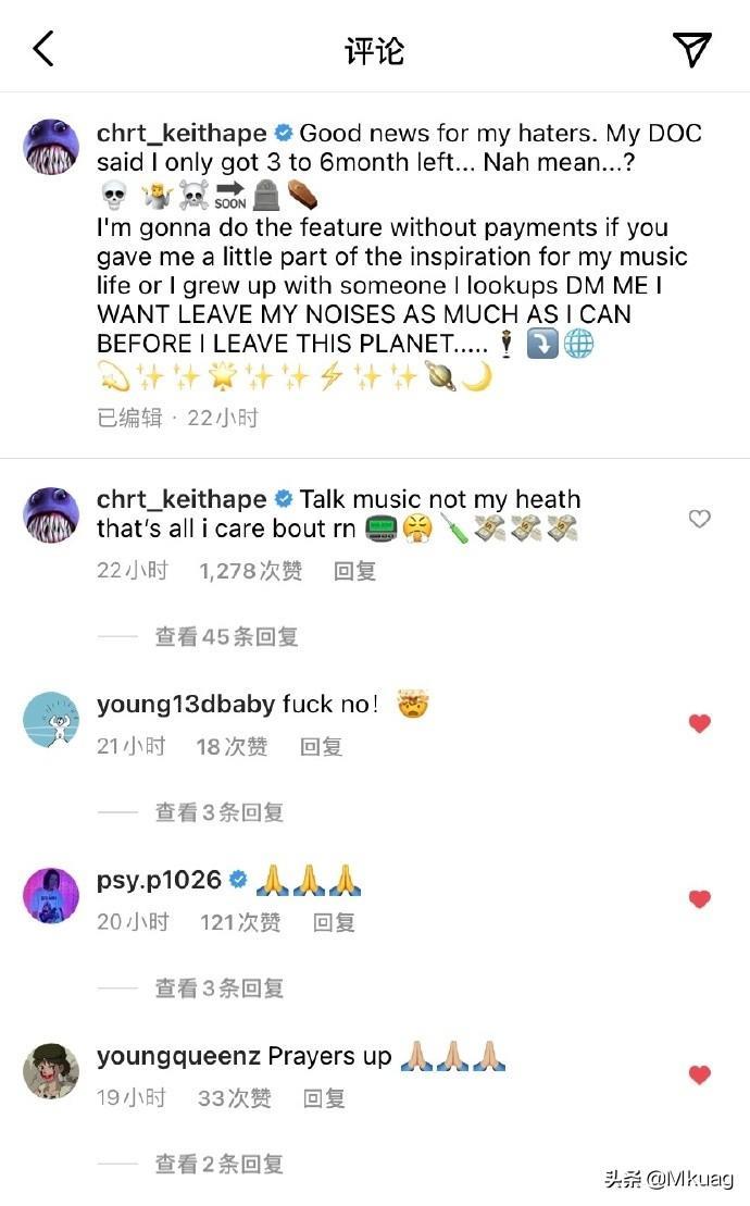 3月20日,凭借热门单曲《It G Ma》一炮而红的南韩说唱歌手 Keith Ape 发 ins 称:“He is dying”。