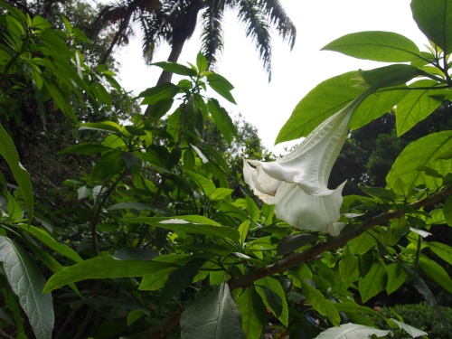 木本曼陀罗,学名:Datura arborea L.,别名大花曼陀罗、天使的号角。茄科曼陀罗属植物。小乔木。