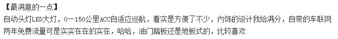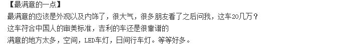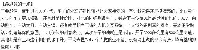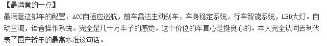 车主们对帝豪GL最满意的主要是外观和高端的配置,如自适应巡航、主动刹车等高端配置,十万的车能有几十万的档次。