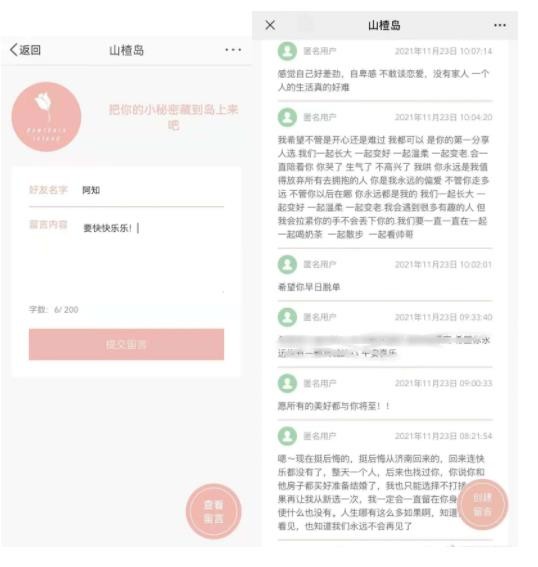 在山楂岛,每一个用户都可以写留言、查看留言,当你为好友或者心上人匿名留言后,闻讯而来的另一方,则可以查看你先前写下的内容。