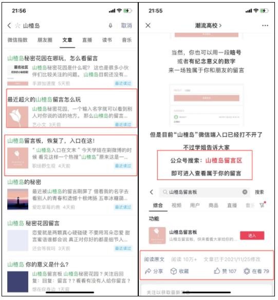 在抖音、快手、小红书、微博等公域平台彻底爆火之后,山楂岛背后的运营团队,立马抢注认证了 10 多个相关的公众号,如山楂岛表白墙、山楂岛APP、山楂岛时光信箱、山楂岛秘密留言等。