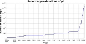 ▲π的近似值记录时间轴图,注意垂直坐标使用了对数坐标。(图自维基)