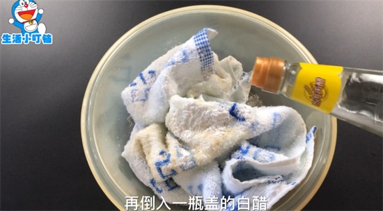 首先我们准备个盆把毛巾放进去,然后倒入两勺食用碱。再滴入一滴洗洁精。再倒入一勺白醋。