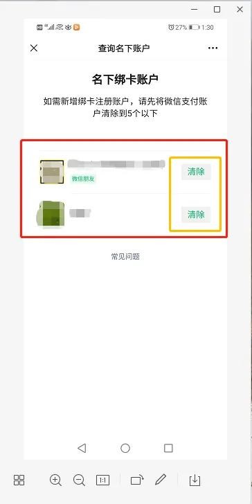最后:就出现了你名下所有绑卡账户,最多五个。家人们可以把没有用的微信账户进行清除,别人就使用不了收付款功能,需要重新实名认证才能进行收付款。(如下图)