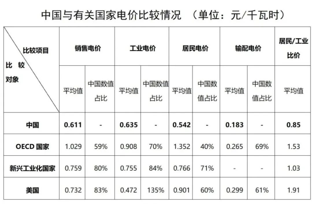 中国拥有极其复杂的电价体系,与国外相比,最大的区别在于国外通常是工业电价低于居民电价,中国则反之。长期以来,我国试行较低的居民用电价格,居民电价较大幅度低于供电成本,是因为工商用户承担了相应的交叉补贴。与国际上其他国家相比,我国居民电价偏低,工商业电价偏高。