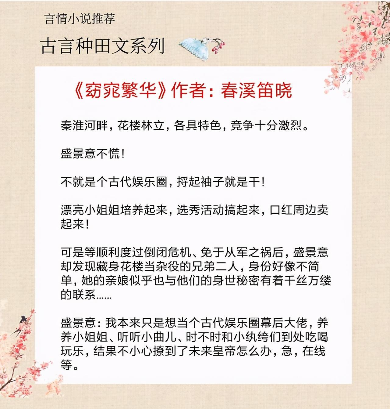 书评:种田文,女主穿越回古代,女主外祖受到被冤枉致死郡王家的牵连,女主母亲入了乐籍,成为花魁后和另外两个姐妹一起开了青楼。女主穿越时自家青楼被隔壁打击一筹莫展,在女主的指点下一步步转型发展成古代娱乐公司,以桃花扇为蓝本培养出相应的演员。还和城内几家贵族搭上线一起赚钱。