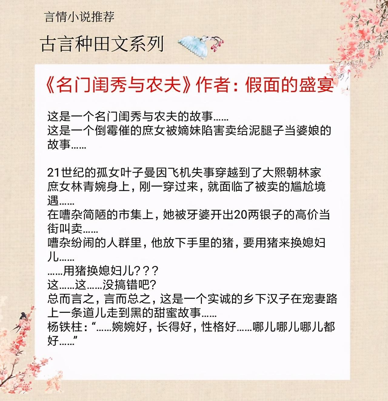 这本书没有太多的大喜大悲, 是比较温馨的一本种田文,细水长流 ,家长里短,但是却别有一番风味。前期种田带领男主家发家, 后期陪男主考取功名。全程没有啥虐点,很温馨。本文行文流畅,虽是种田文,剧情设定不落俗套,人物性格鲜明,男女主的相处温馨又不失自然,不失为一篇穿越种田文佳作。五本古言种田文,没有太多的大喜大悲,但细水长流也别有一番风味!