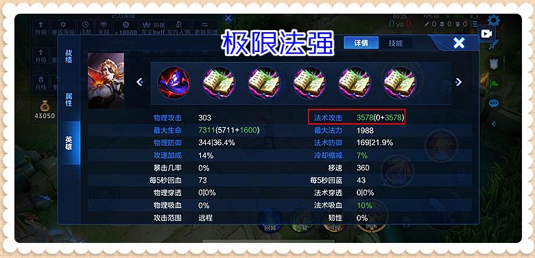 为了极限堆高法强,我铭文选择的是圣人、轮回、献祭,这样在帽子和5本大书的加持下,米莱狄的法强来到了惊人的3578。