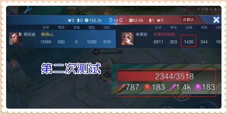 第二次测试时,米莱狄的法强是1426,机器人的物攻为787,生命值为3518。