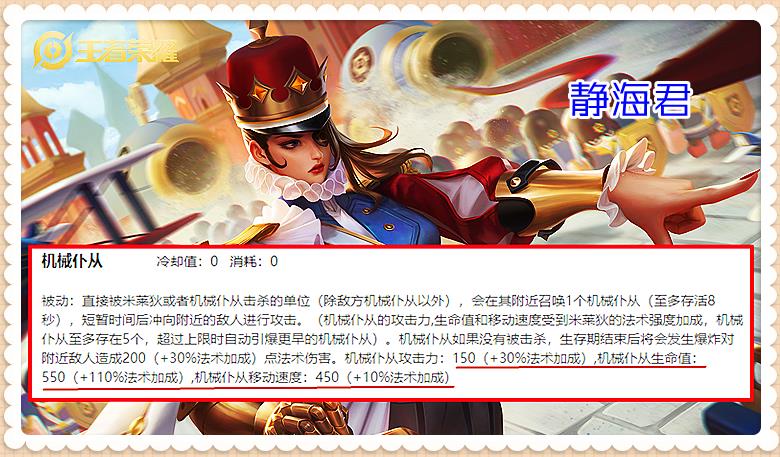 机器人的生命值=550(+100/lv)+110%ap加成机器人的物理攻击力=150(+15/lv)+30%ap加成机器人的双抗是183,不随米莱狄的法强变化而变化机器人的法强=米莱狄法强,实际没有任何用处机器人的移速没办法准确测试,暂且不计