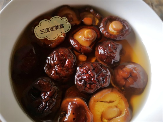 2. 干香菇洗干净表面的灰尘,用温水提前泡发,泡发后的香菇水不要倒掉,过滤掉杂质备用;