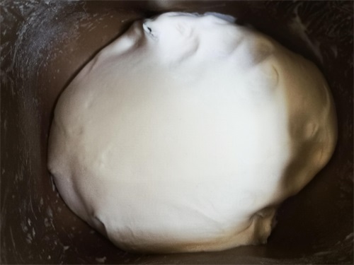 1. 面包机桶内放入350克面粉、210克清水、少许盐,启动和面模式,让机器自动和面,10分钟后,面团和好,醒发一会儿;