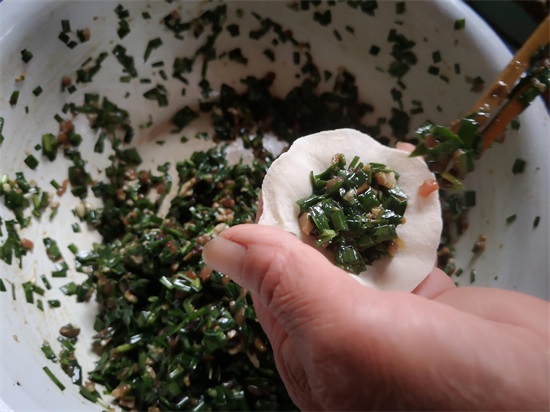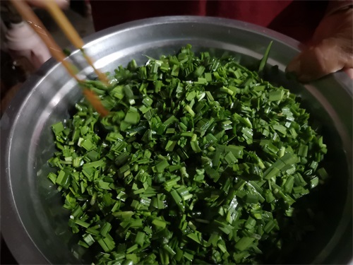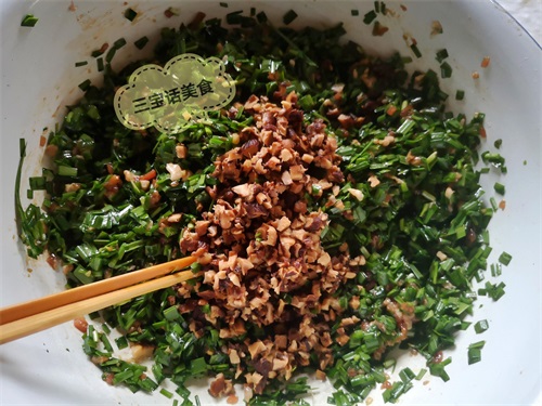 2. 韭菜切好后要用植物油拌匀,封住水分,这样韭菜就不会出水;
