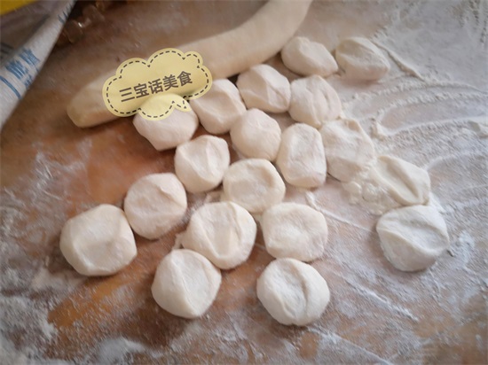 6. 取出醒发好的面团,揉圆,搓成长条,切成小剂子,揉圆压扁;
