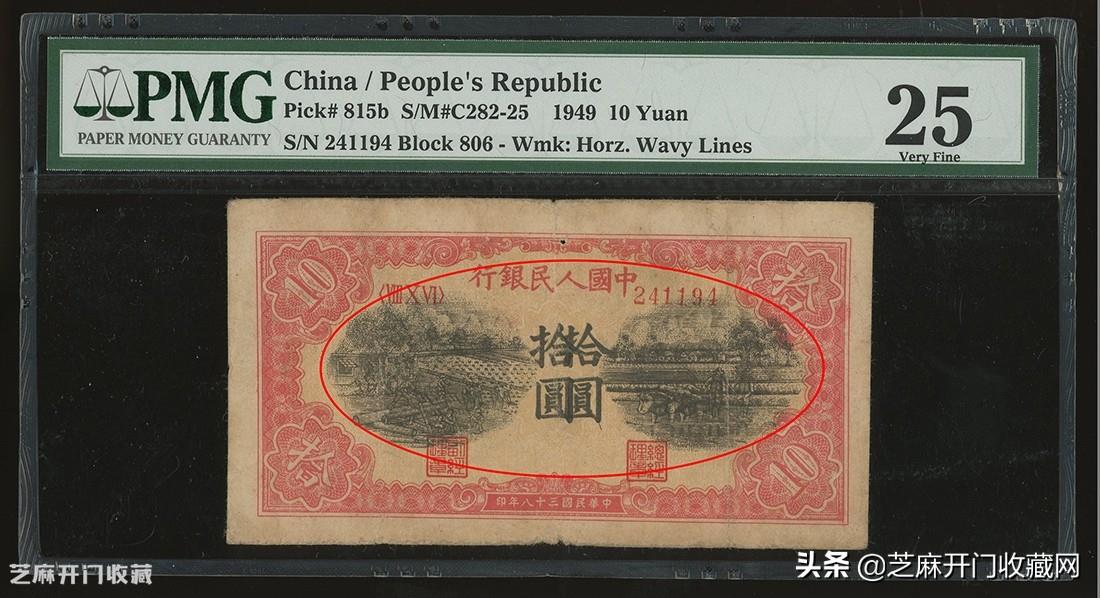3:中国人民银行第一版人民币10元,锯木犁田,正面拾圆二字複印,PMG鉴定,平30,成交价格: HKD 66000