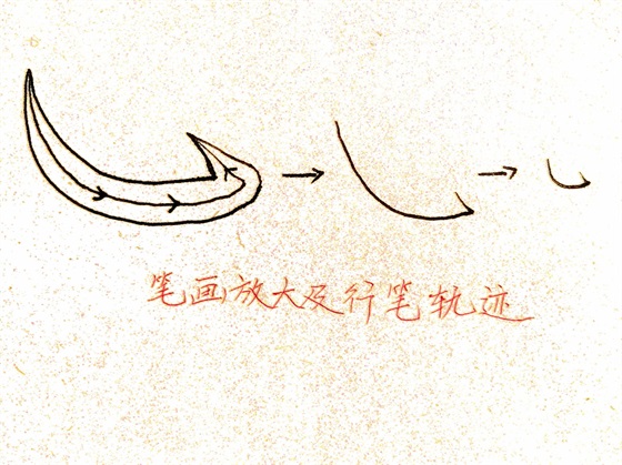 卧钩:起笔稍轻,由轻到重右下行笔↘,再弧度和长度适当时,转为横向水平行笔,行至钩处左上↖迅速提笔出钩。下面是笔画放大和行笔轨迹。