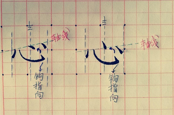 小编翻阅众多书法字帖,包括古人和现在的书法家字帖。发现“心”字的两个写法,重点在于三个点的位置。左面的第一点竖点起笔基本于卧钩的起笔高度相等,实际书写中也不会有太大起伏。看图小编给画了四条分割线。先看轴线,轴线就是三点的轴心,无论怎么书写不能脱离轴线,最常见的两种就是中间点的上下起伏,1、点的起点在轴线上 2、点的末端在轴线上。写出来的效果都还不错。最后一点卧钩的回钩基本指向中间点也就是第二个点画,且第二点在整个字体处在中间线位置。下面是小编自己练习的情况。两种写法都写了: