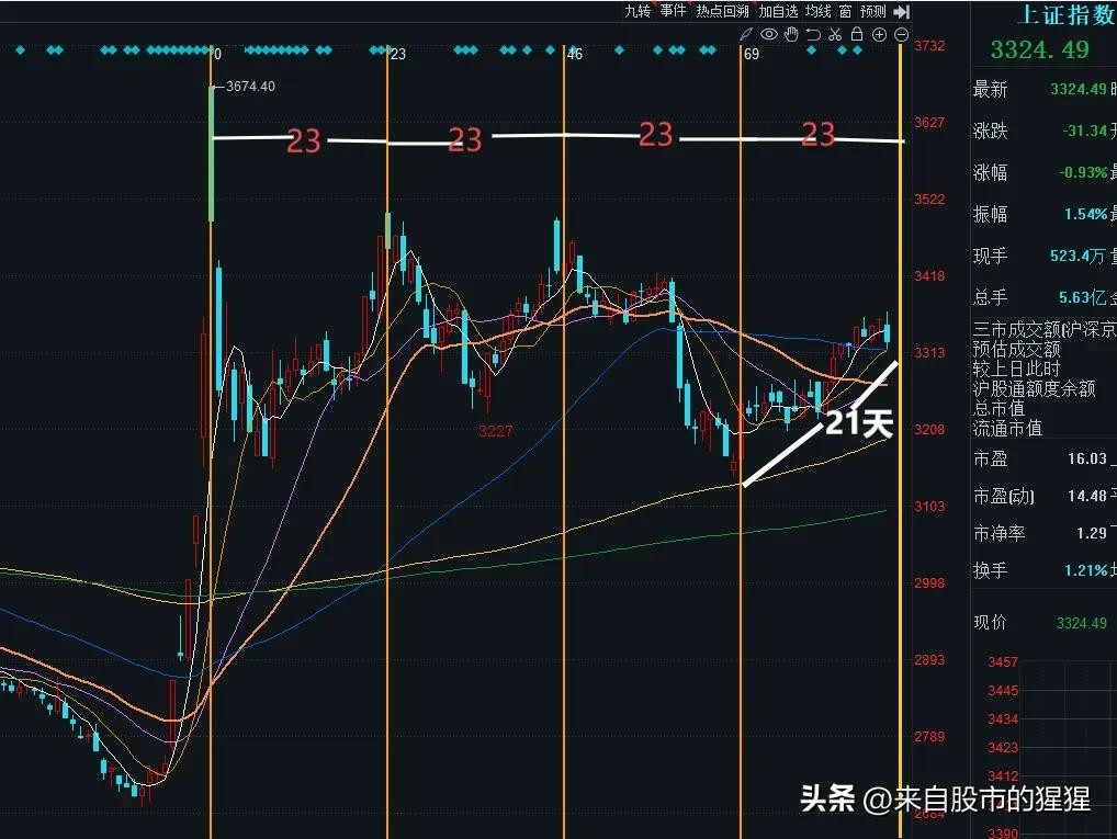 第二,各大指数都涨到了符合变盘时间窗口的时候。以上证指数为例。我们可以看到上证指数不仅到达低点到高点的21个交易日。21是典型的菲波纳契变盘数字。在21天产生阶段拐点的概率非常大!而且也到达近期最关键的变盘时间窗口“23天”这样一个变盘时间窗口附近。大家请看下图——上证指数日线图。