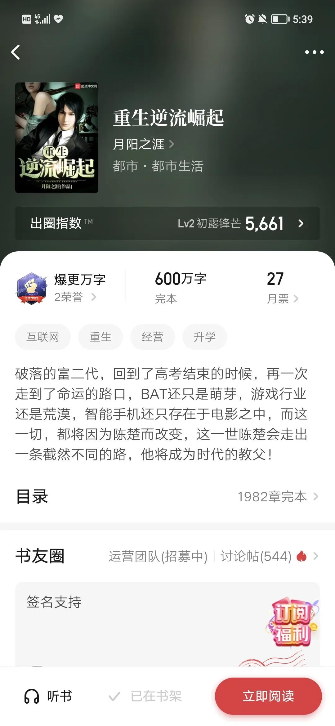 本文是起点Lv5作家:月阳之涯 在2018年11月创作的小说 重生逆流崛起,本书讲述了破落的富二代,回到了高考结束的时候,再一次走到了命运的路口,BAT还只是萌芽,游戏行业还是荒漠,智能手机还只存在于电影之中,而这一切,都将因为陈楚而改变,这一世陈楚会走出一条截然不同的路,他将成为时代的教父!