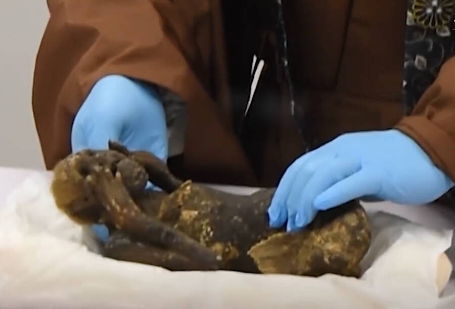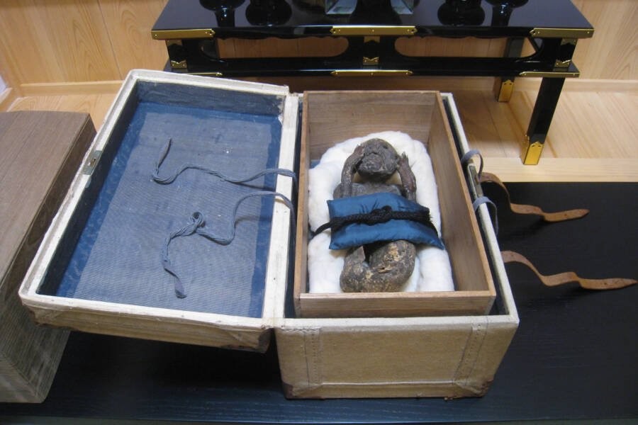 近年,人们才在圆珠院偶然发现了装有这具神秘木乃伊的盒子。大约 40 年前,它曾被展示供信徒祈求长寿,但最终这具木乃伊被封存。与此同时,人们还发现了一封 1903 年的奇怪信件。